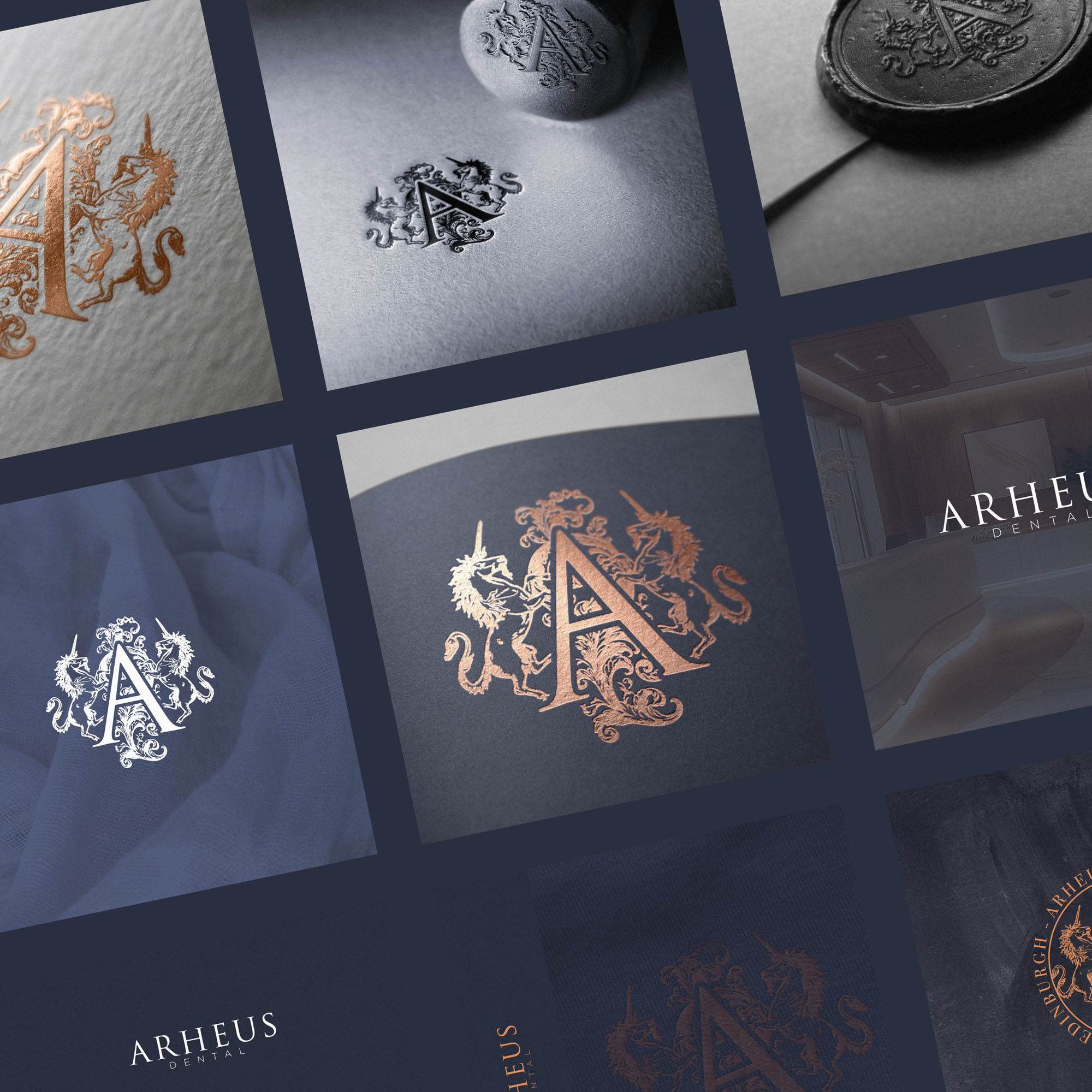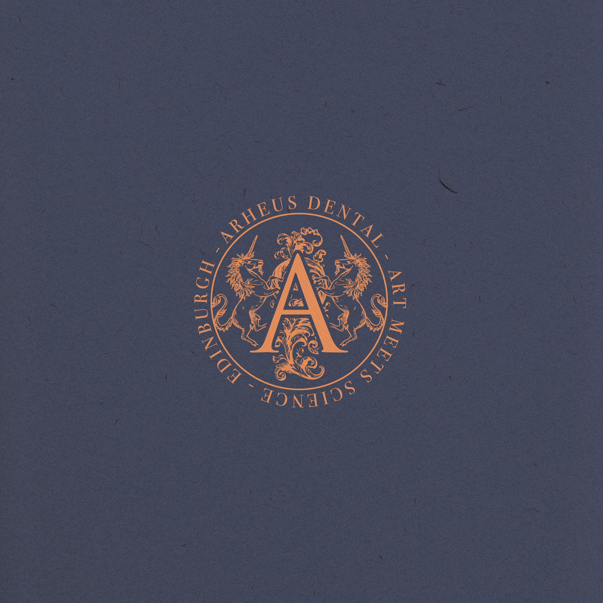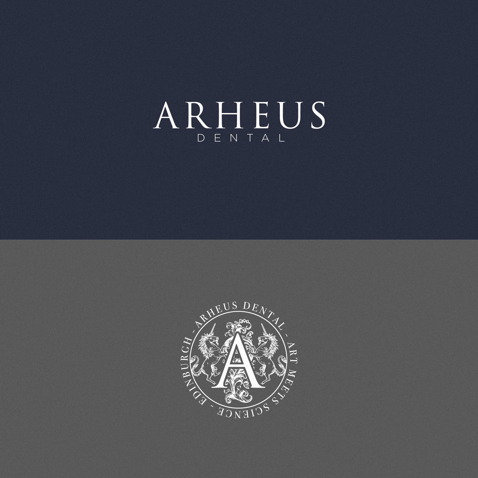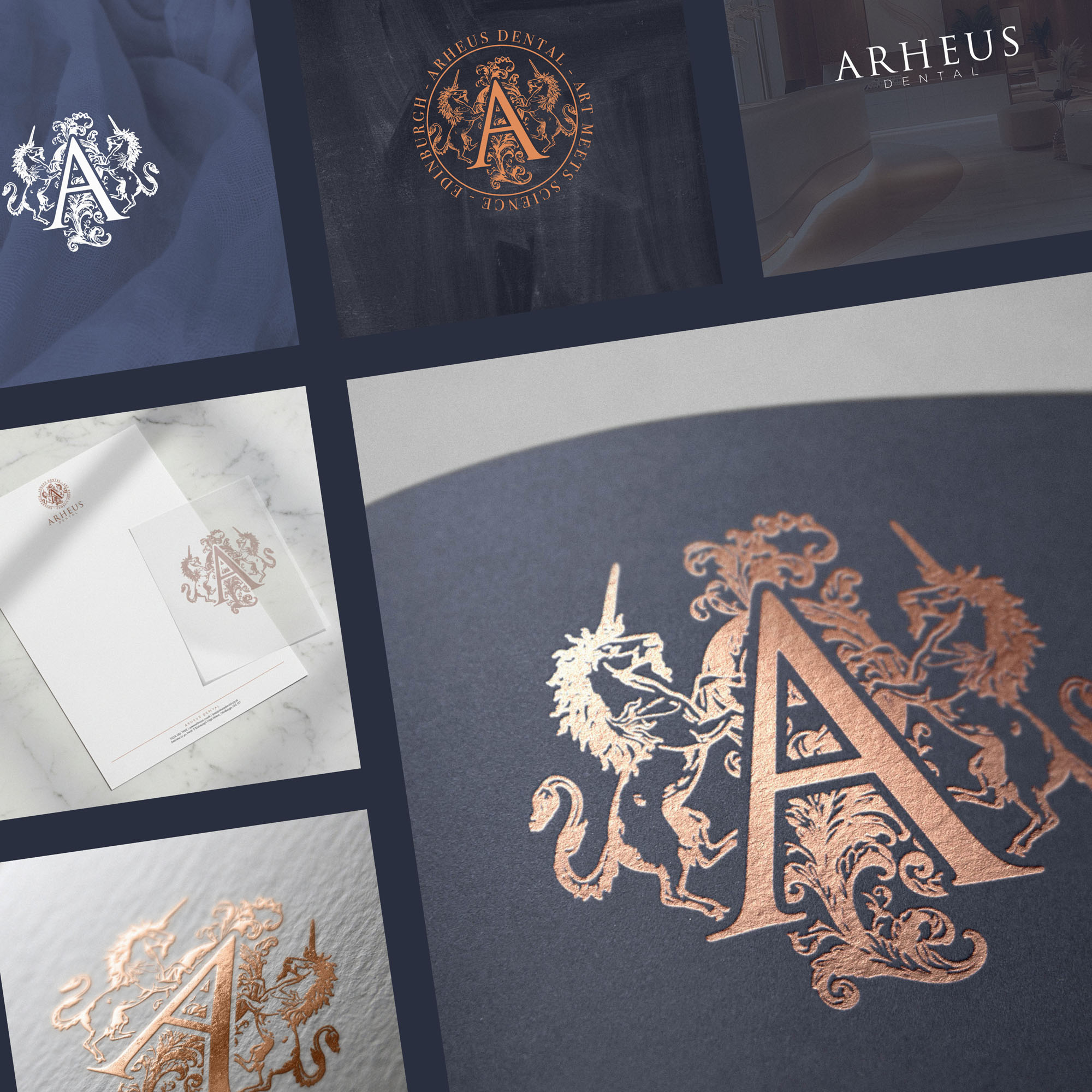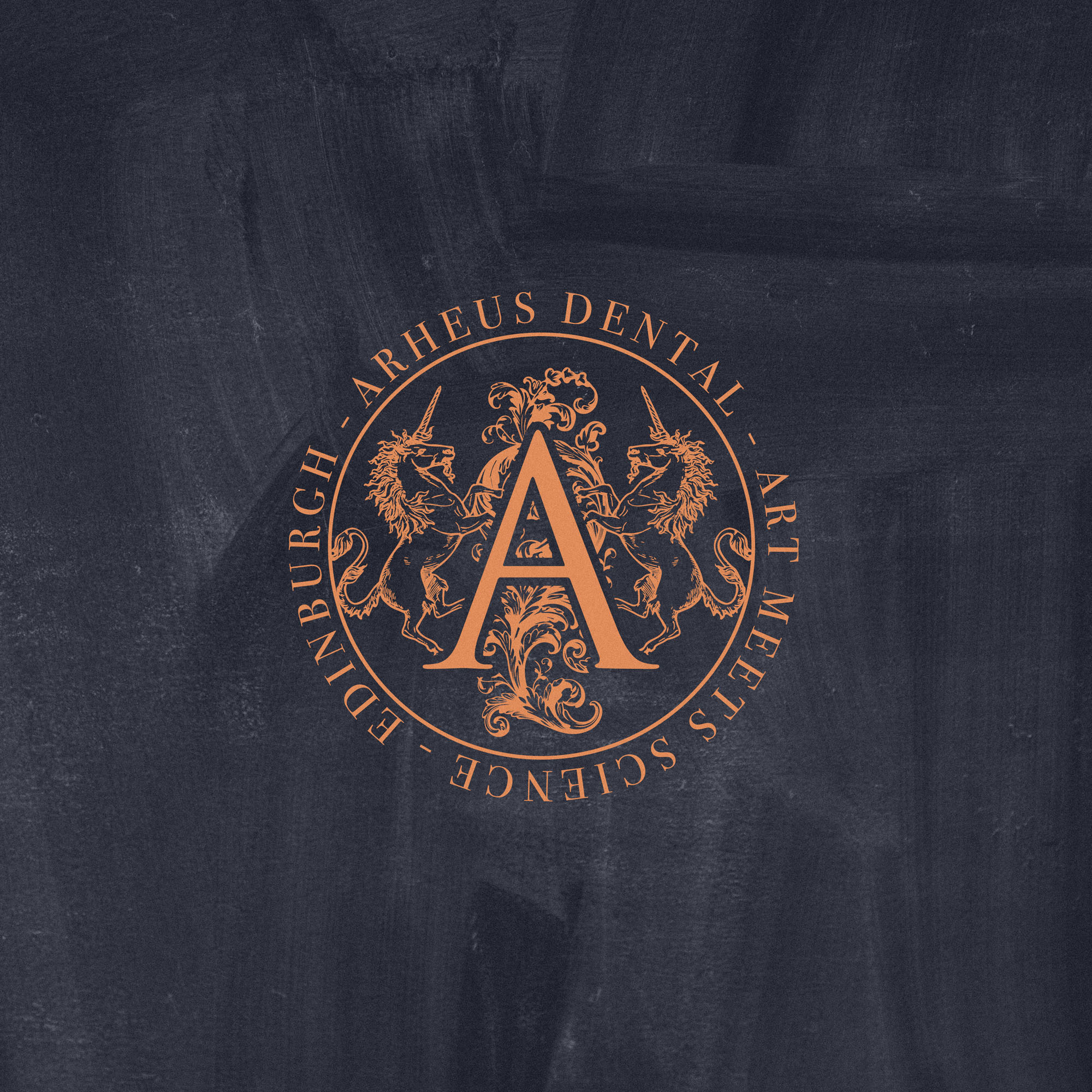 We wanted the new Brand Identity for Arheus Dental to celebrate the it’s physical location in Edinburgh; a Scotish city with a rich heritage and history. The brandmark identifies Arheus as a Heritage brand at a glance, with two unicorns (the national animal of Scotland) along with decorative flourishes framing a lettermark A in a style similar to royal crests, coats of arms… all playing into the rich history of the city. This was also a fitting representation of the many years of experience between Dentists at the practice, and the high end, luxurious experience they provide patients.