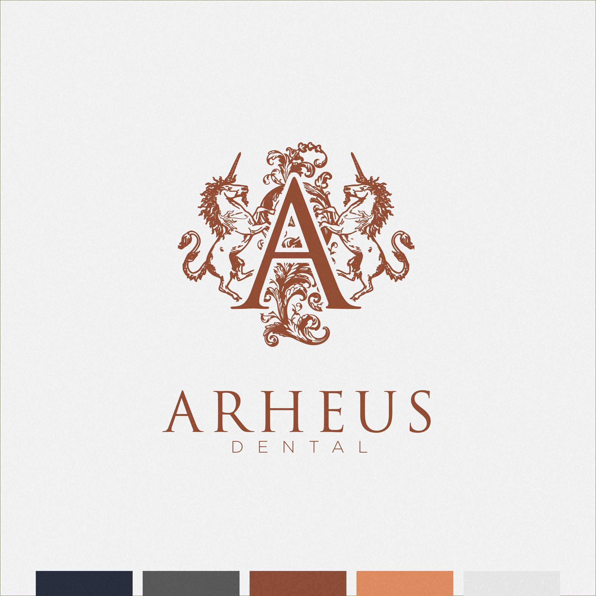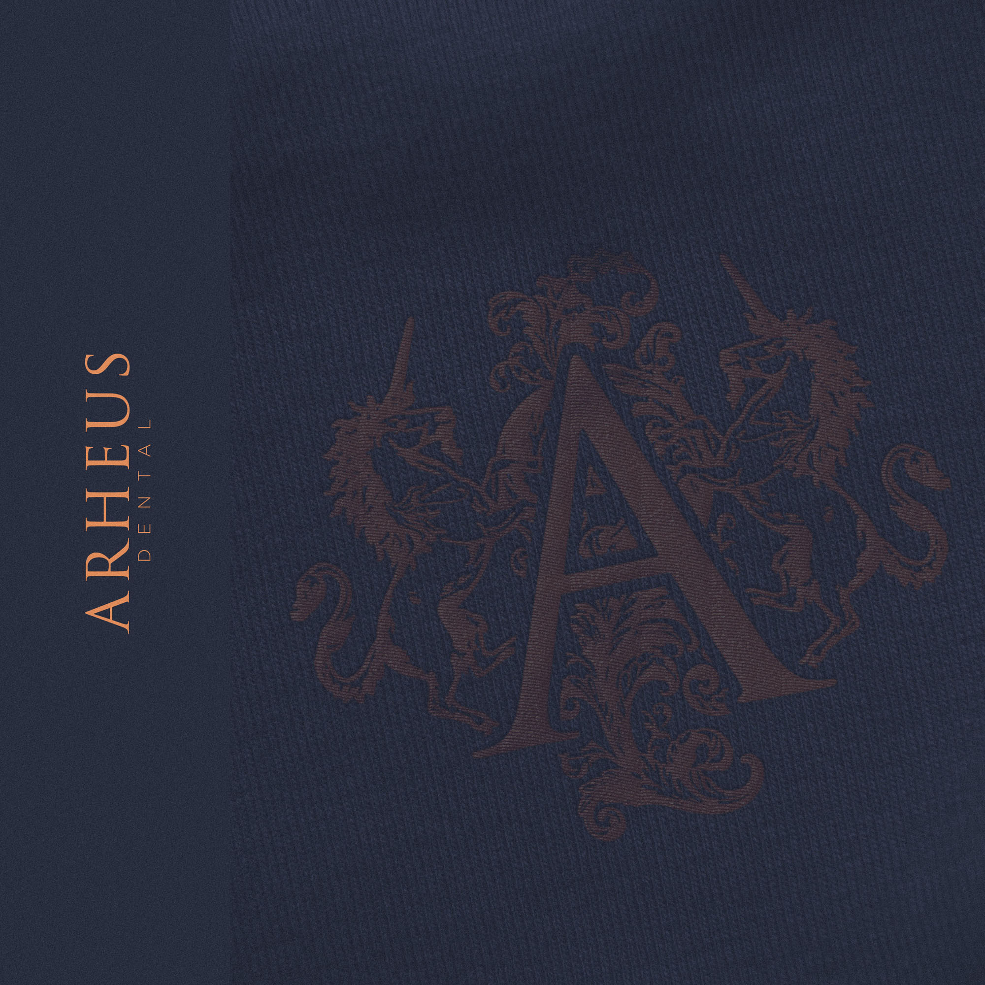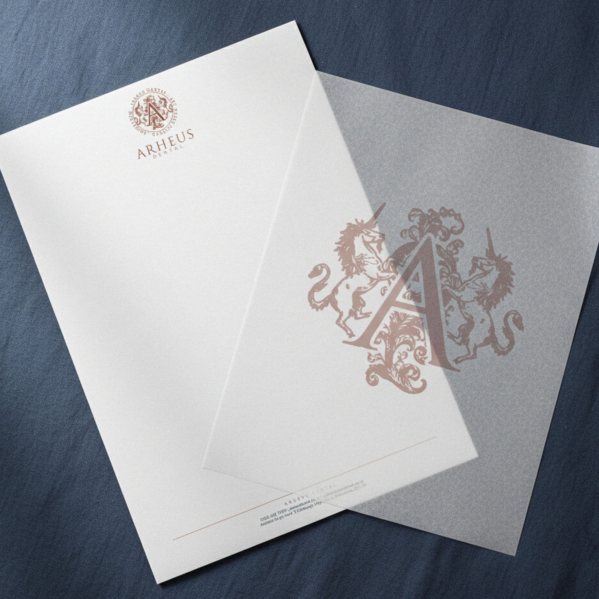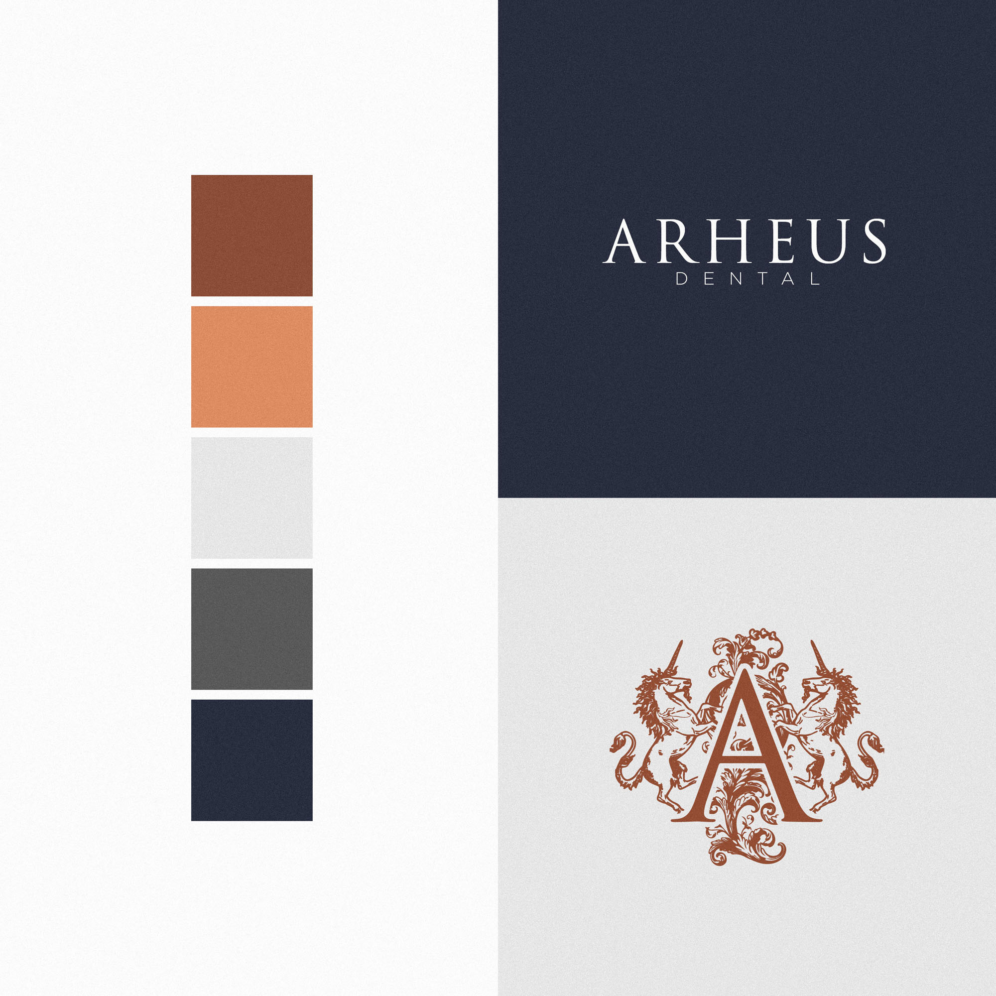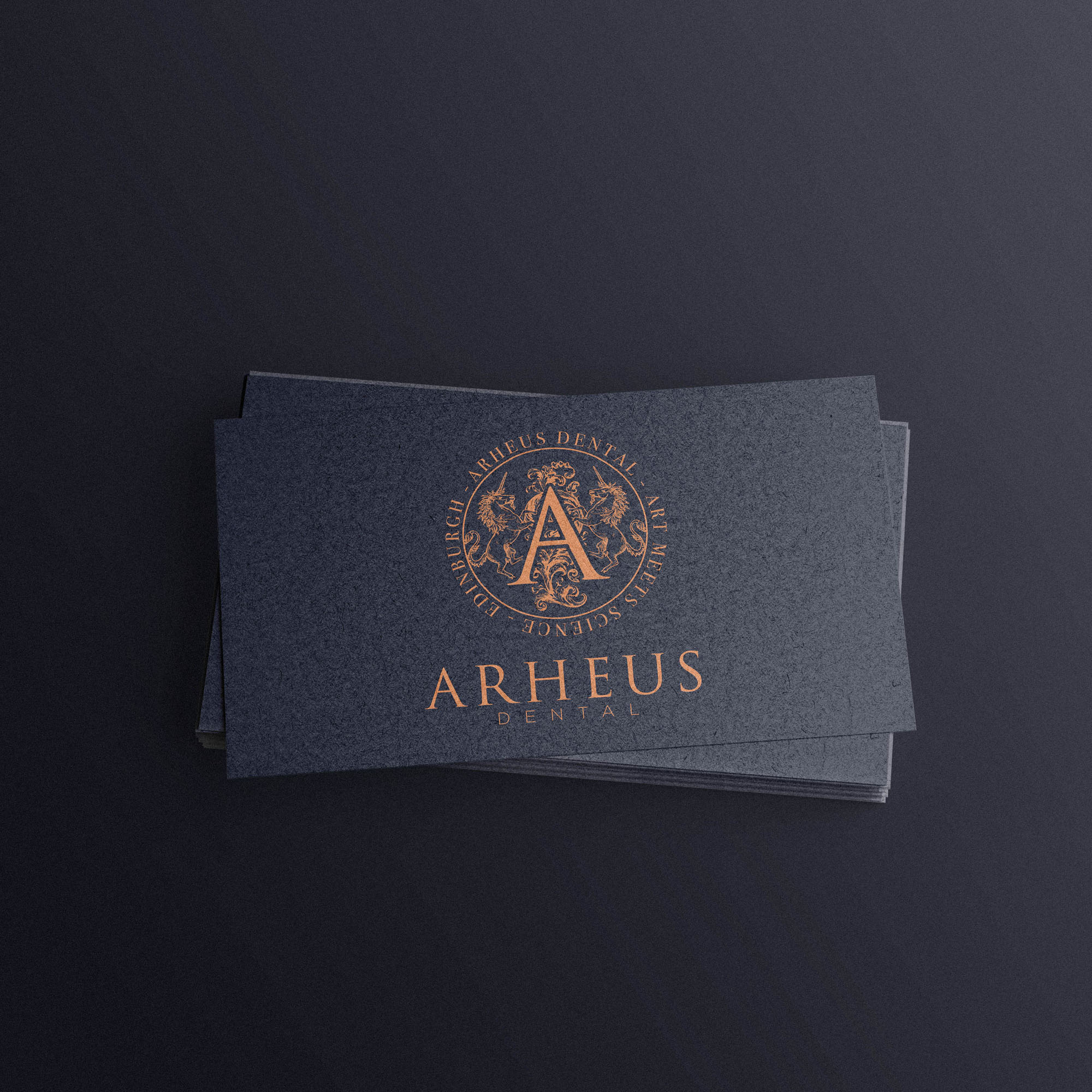 We wanted the new Brand Identity for Arheus Dental to celebrate the it’s physical location in Edinburgh; a Scotish city with a rich heritage and history. The brandmark identifies Arheus as a Heritage brand at a glance, with two unicorns (the national animal of Scotland) along with decorative flourishes framing a lettermark A in a style similar to royal crests, coats of arms… all playing into the rich history of the city. This was also a fitting representation of the many years of experience between Dentists at the practice, and the high end, luxurious experience they provide patients.