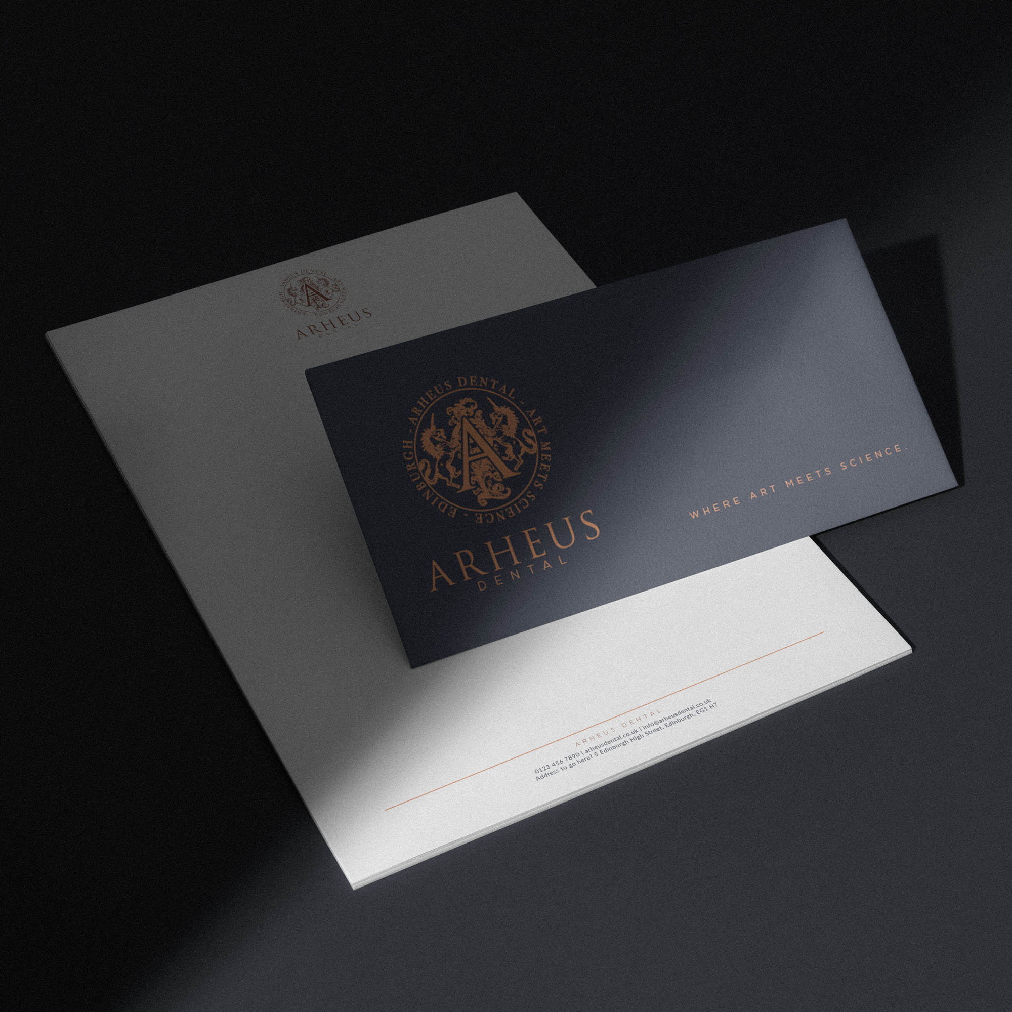 A cohesive platform for premium patient materials, referral packs, signage and digital communication—ready for foil-embossed brochures, wax-sealed documents and day-to-day applications—so Arheus Dental can expand touchpoints while maintaining a richly crafted, Edinburgh-rooted identity.