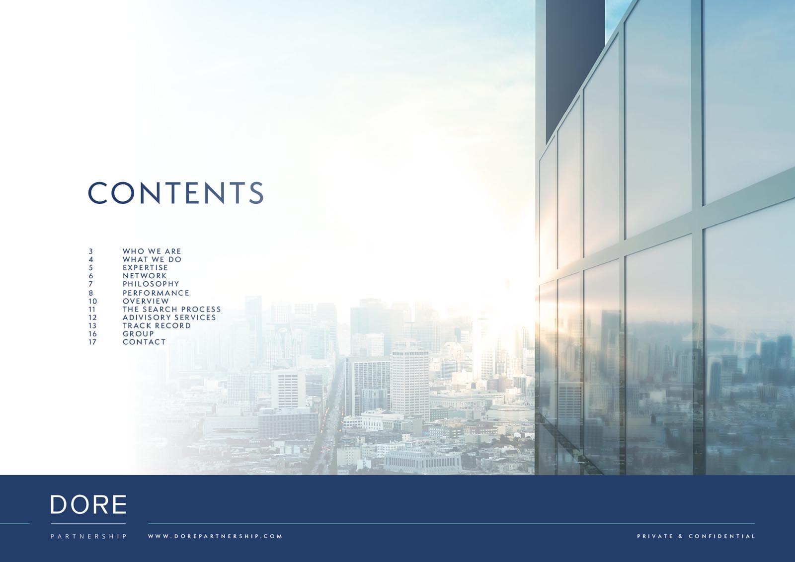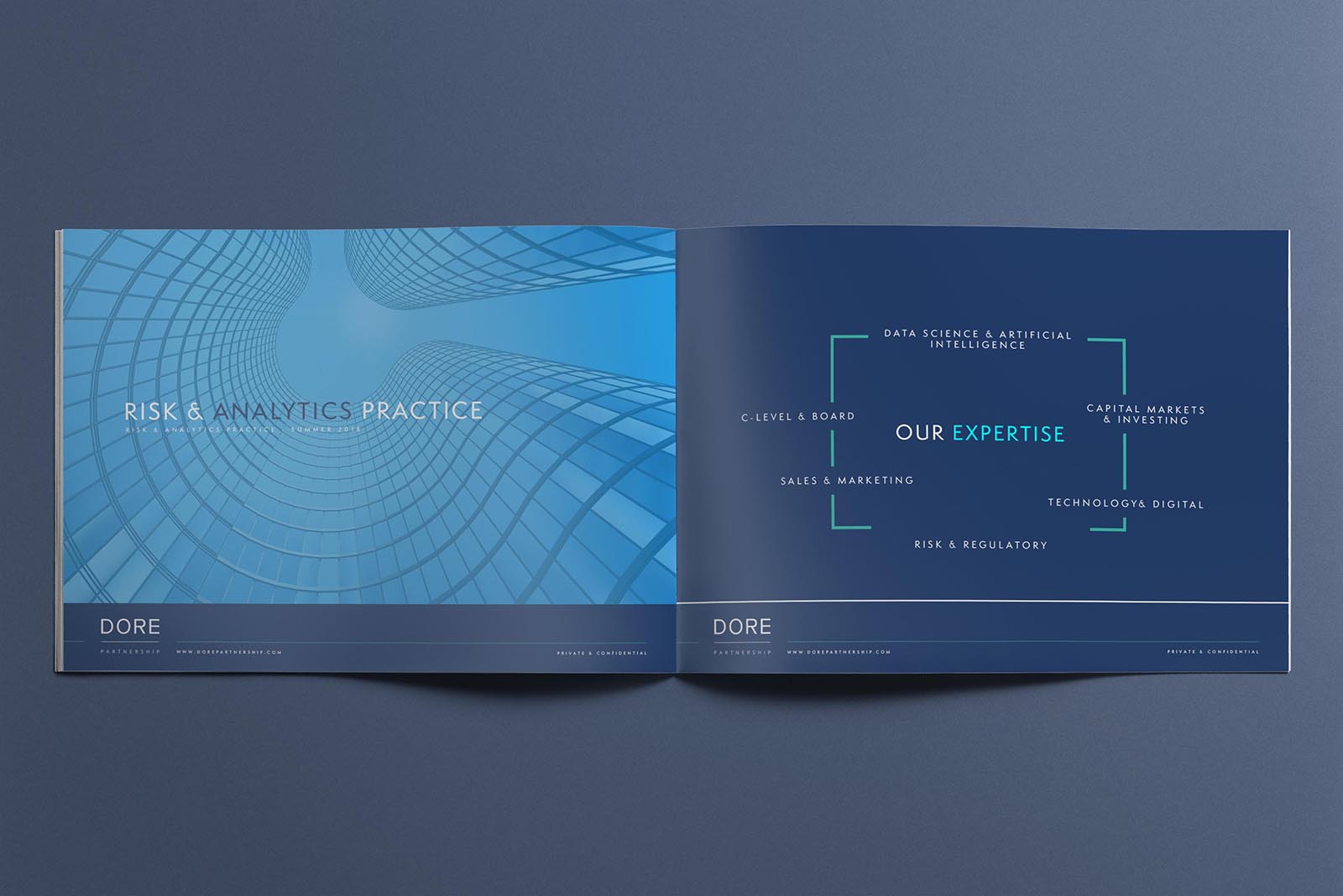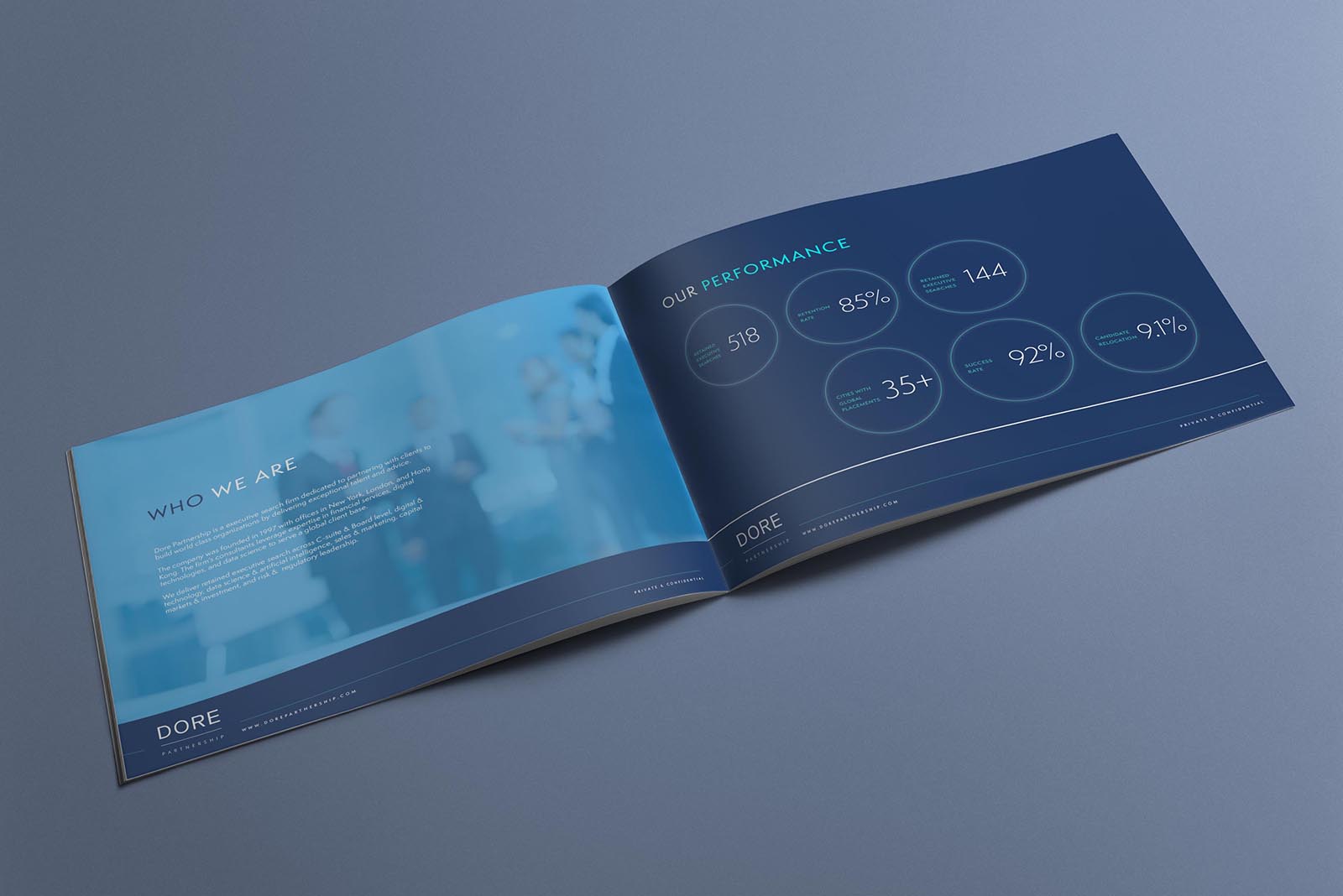 Landscape brochure designed for the Dore Partnership, leaders in Global Executive Search. We wanted to reflect the brands core values, adhering to existing brand guidelines to ensure consistency, while presenting a high level overview in a visually engaging way. Generous use of charts, icons and infographics enabled us to convey key points in a clear, dynamic way, while maintaining a highly professional, corporate appearance.