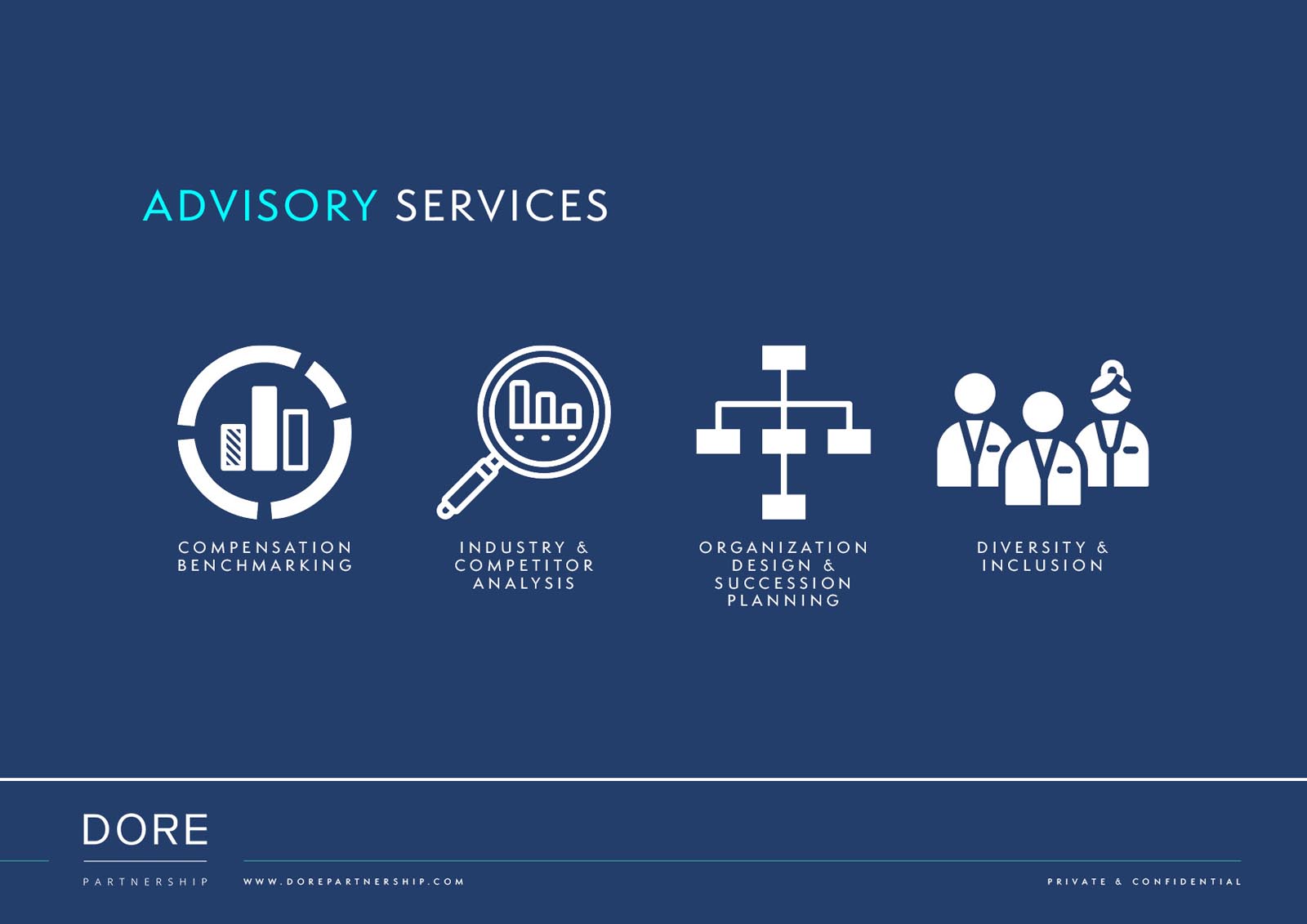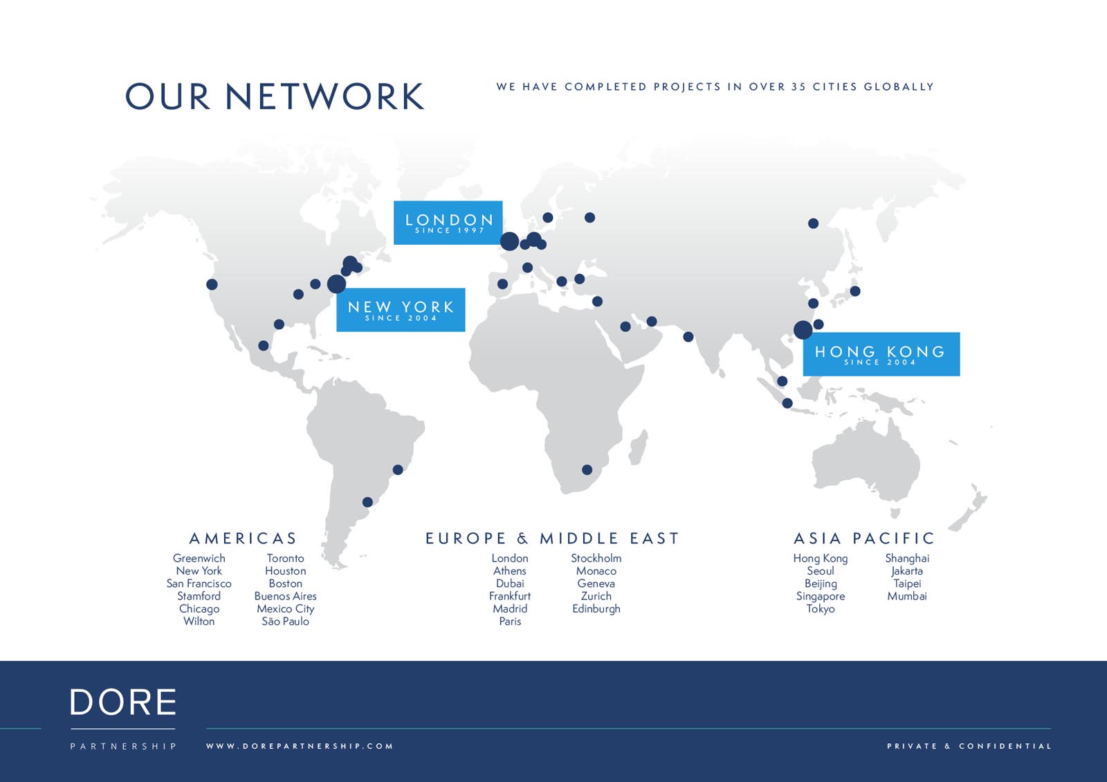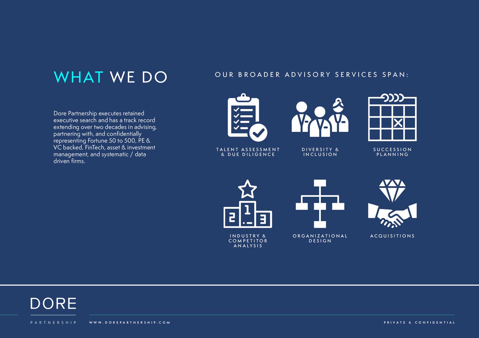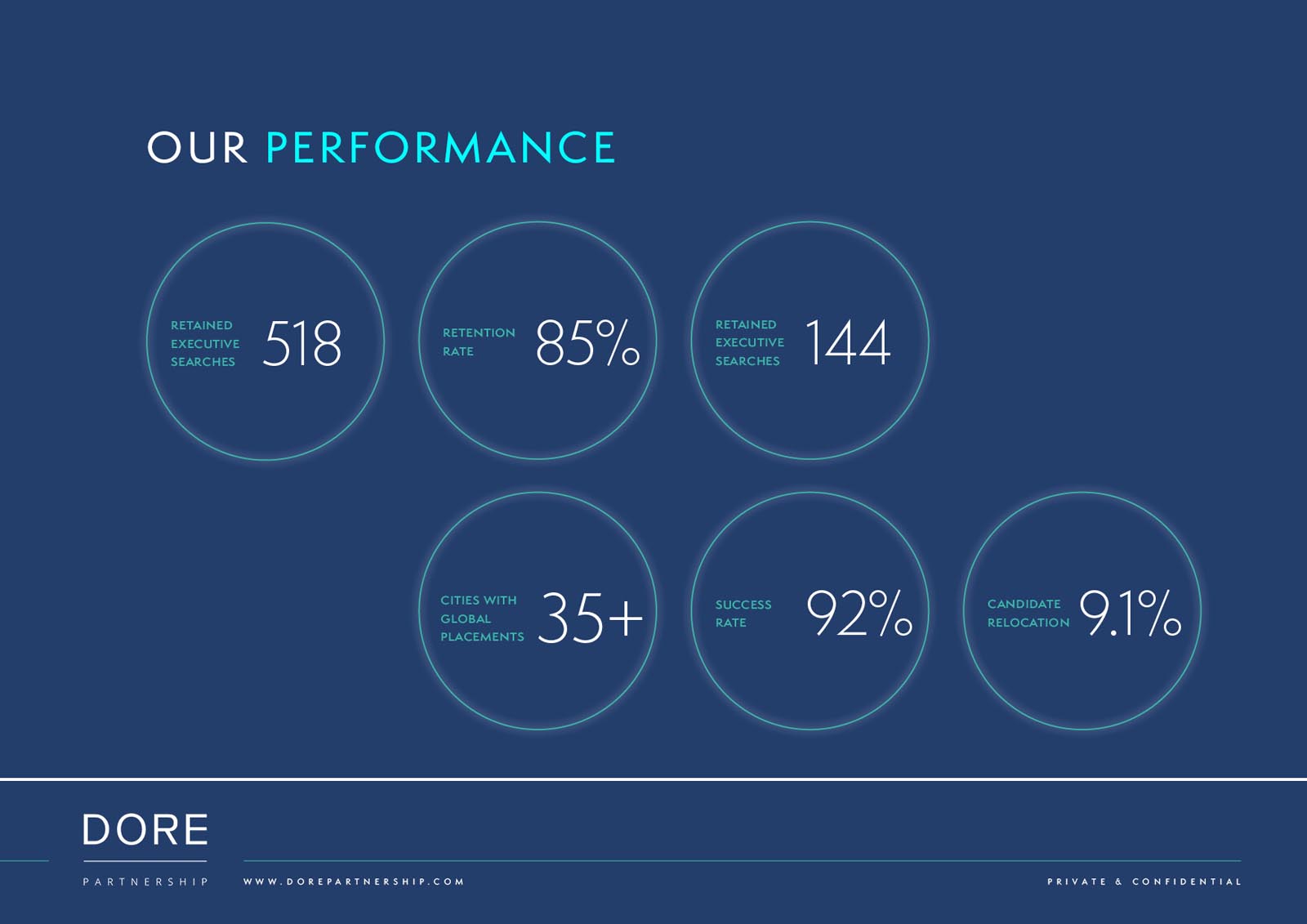 Landscape brochure designed for the Dore Partnership, leaders in Global Executive Search. We wanted to reflect the brands core values, adhering to existing brand guidelines to ensure consistency, while presenting a high level overview in a visually engaging way. Generous use of charts, icons and infographics enabled us to convey key points in a clear, dynamic way, while maintaining a highly professional, corporate appearance.